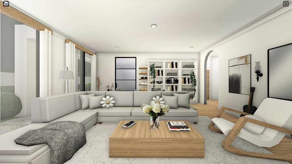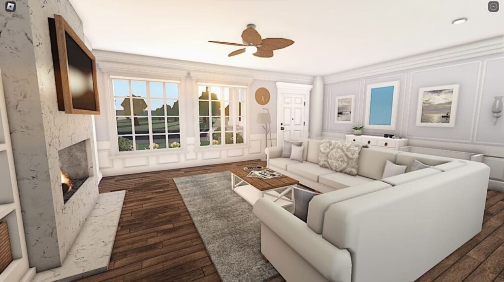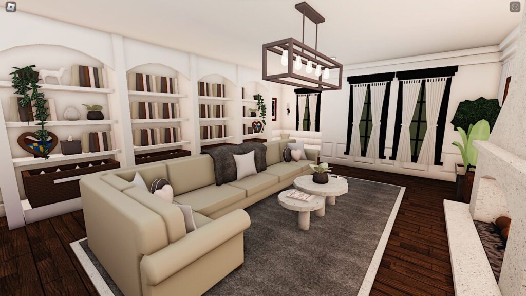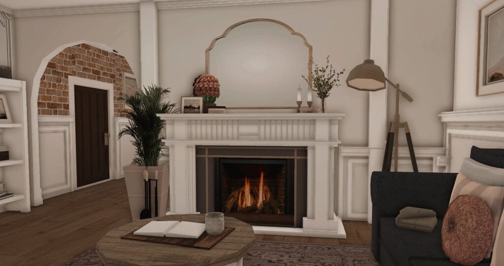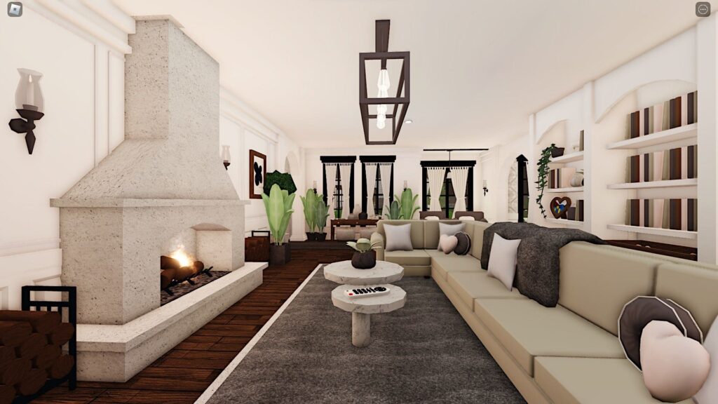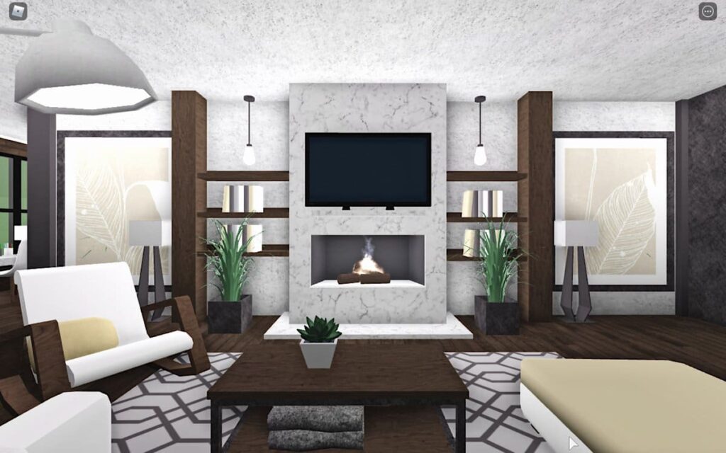 It creates a very polished and high-end energy, leaning into an aesthetic of organized luxury and contemporary style. The clean lines of the furniture, paired with the geometric rug pattern, give the space a sophisticated, adult feel. This look is perfect if you want your Bloxburg living room to feel grounded and stylishly put-together, like a designer apartment. Try using marble material for the fireplace surround to instantly elevate the feeling of the room.