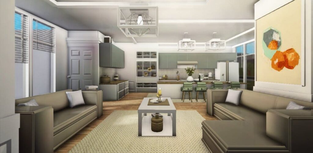 The mood is functional and sleek, perfect for a character who loves to host casual dinners or multitask between cooking and relaxing. The continuity of the flooring helps the spaces blend naturally. To create zones in an open space like this, use opposing furniture arrangements and large area rugs to clearly demarcate the living area from the kitchen without needing dividing walls.