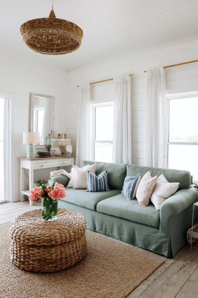 This beautiful coastal-inspired living room features a slipcovered sofa in a pale, seafoam green, perfectly balanced by crisp white walls and sheer curtains that filter the natural light. The soft color is accented by gentle pink and striped blue-and-white pillows, adding a subtle nod to beachside hues. A massive, round woven wicker ottoman/coffee table and jute rug anchor the space, injecting necessary natural texture to contrast the clean whites. This design achieves a feeling of light, effortless elegance and tranquility, offering a fresh, airy take on the green couch living room idea.