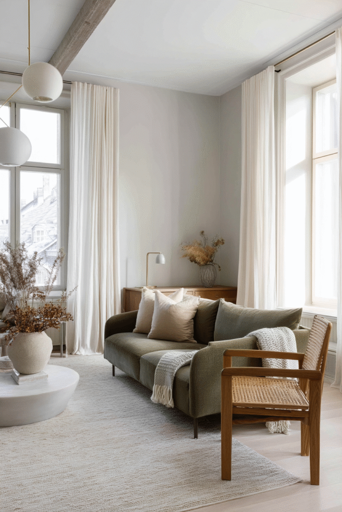 A soft, olive-green sofa with thin, modern metal legs is the centerpiece of this calm, Nordic-inspired space, which features a palette of warm, creamy whites and natural wood tones. The focus here is on soft, sensory textures like a plush cream throw blanket and natural materials, seen in the wood chair and the dried floral arrangement. The room’s high ceilings and floor-to-ceiling cream curtains maximize the feeling of light and serenity. This look is quiet, refined, and utterly restful, proving that a green couch can be the definition of subtle elegance.