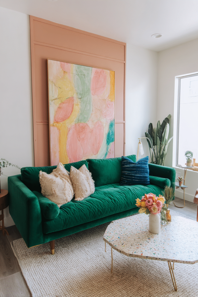 A luxurious, deep emerald-green velvet sofa provides a stunning contrast to a vibrant, oversized abstract painting in shades of pastel pink, yellow, and red, backed by a dusty rose accent wall. The plush, tufted design of the sofa suggests a touch of retro glamour, while the unique terrazzo coffee table adds a modern, playful pattern to the mix. The bold color pairing creates a visually exciting and highly stylized atmosphere that feels daring and totally custom. This room is a burst of joyful energy and creative confidence, proving that green can be the perfect anchor for a colorful statement.