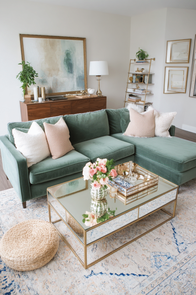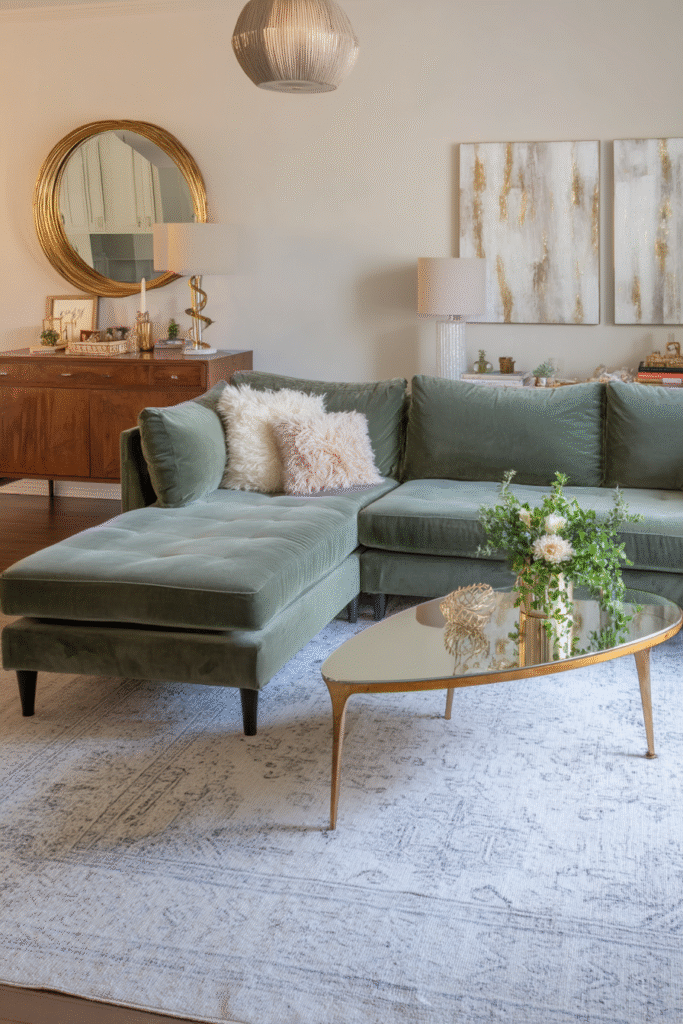 A plush, pale sage-green velvet sectional commands attention, beautifully contrasted with a mirrored coffee table framed in gold and a delicate, patterned rug in soft blue and blush tones. The velvet fabric catches the light beautifully, enhancing the sofa’s luxurious texture, while the reflective surfaces of the coffee table add brightness and depth. The room feels polished, feminine, and subtly glamorous, achieving a lovely balance between soft, inviting color and high-shine finishes.