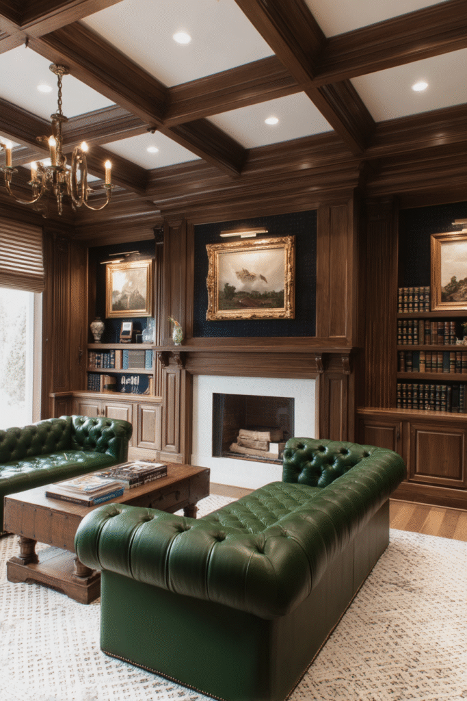 For a masculine, classic, and sophisticated look, two deep forest-green leather tufted Chesterfield sofas are set in a library-style room framed by dark, coffered wood paneling and built-in bookshelves. The green leather is a quintessential English design element that brings a traditional, stately weight to the space. The gold frames on the artwork and the ornate chandelier add rich, historical detail and a sense of timeless luxury. This green couch living room is the epitome of a cozy, scholarly retreat, feeling incredibly established, warm, and club-like.