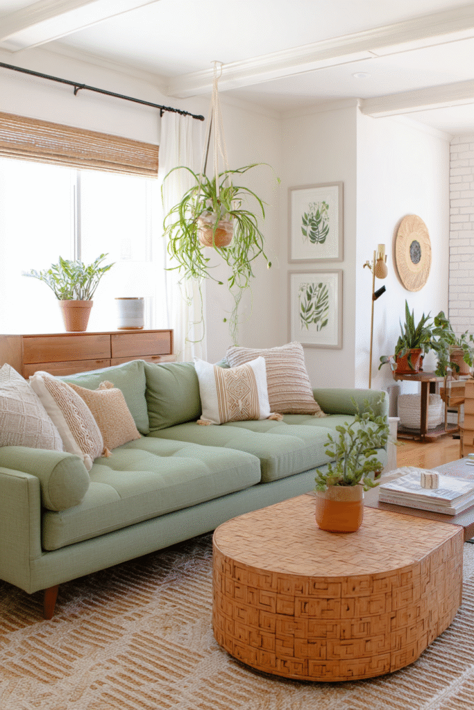 A bright, contemporary living room features a button-tufted light sage-green sofa paired with a variety of cream and textured beige pillows, enhancing the fresh, airy atmosphere. The large, sculptural round coffee table made of stacked natural wood pieces adds a significant, organic anchor to the center of the room. Plenty of natural plants, hanging and potted, tie the couch color back into the room’s theme, supported by framed botanical prints on the wall. This design feels perfectly balanced between modern clean lines and the warmth of natural, handcrafted materials.