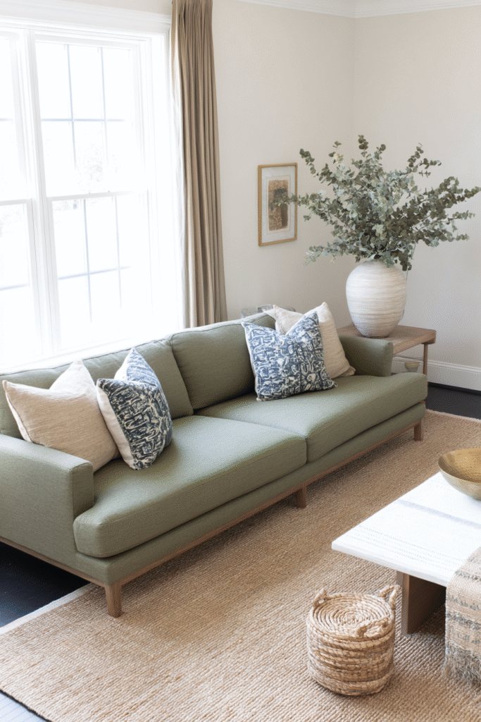 In this spacious, bright room, a sophisticated, structured sage-green sofa sits on a large, woven jute rug, providing a warm and earthy foundation. The color palette is kept light and serene, with creamy white walls and a large, textured white vase holding eucalyptus branches. The navy and beige patterned pillows add just the right amount of visual interest without disrupting the room’s tranquility. The space feels refined, open, and quietly luxurious, proving the versatility of a softer, more muted green.