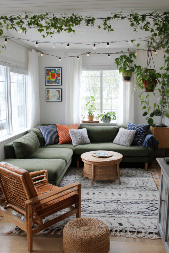 A comfortable, deep olive-green sectional sofa creates a welcoming corner, perfectly suited for socializing or curling up by the window. The room is decorated with string lights draped across the ceiling and plenty of hanging and potted plants, giving it a playful, intimate, and slightly whimsical garden-shed feel. The bright pillows and rattan chair add vibrant texture and color, enhancing the casual, sun-drenched mood. This is a wonderfully cozy, relaxed space that feels personalized and utterly inviting, perfect for long, lazy weekends.