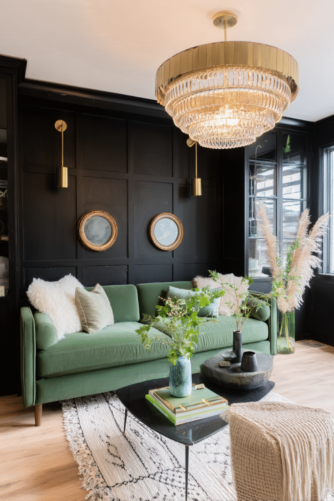 In this luxuriously moody living room, a classic, tailored green velvet sofa pops against a sophisticated matte black paneled wall, lit by a magnificent tiered brass and crystal chandelier. The green of the sofa takes on an almost teal-like richness under the warm lighting, creating an atmosphere of exclusivity and high-end glamour. The brass accents on the chandelier and wall sconces provide a gorgeous metallic contrast to the dark backdrop, infusing the space with a deco-inspired flair. This is a room that feels sumptuously dramatic and intimately cozy, perfect for quiet evenings with a decadent flair.