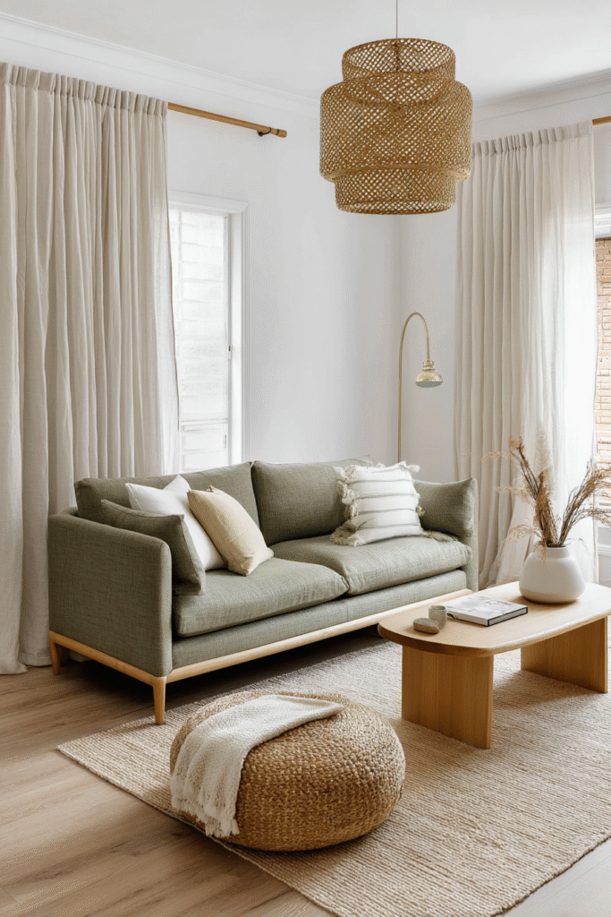 This serene space features a simple, modern sage-green linen sofa with an exposed wooden base, surrounded by light, airy textures like floor-to-ceiling sheer linen curtains and a natural straw pendant light fixture. The minimal color palette focuses on whites, light wood, and natural greens, creating a wonderfully cohesive and calm Scandinavian-inspired look. The subtle textural elements, like the woven pouf and braided rug, prevent the room from feeling stark, instead adding warmth and softness. The overall feeling is one of quiet luxury, natural beauty, and extreme relaxation.