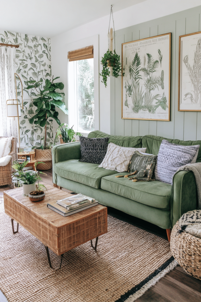 In a space designed to feel like a botanical escape, a muted olive-green velvet sofa is perfectly matched with a variety of textured, nature-themed pillows and a light sage-green paneled accent wall. The room features a stunning wallpaper with a white and green leafy pattern, creating an immersive, layered look. A chunky, rustic wood coffee table and a large jute rug introduce earthy texture and grounding warmth. This design is effortlessly cohesive, feeling like a cozy, vibrant jungle filled with rich colors and organic patterns.