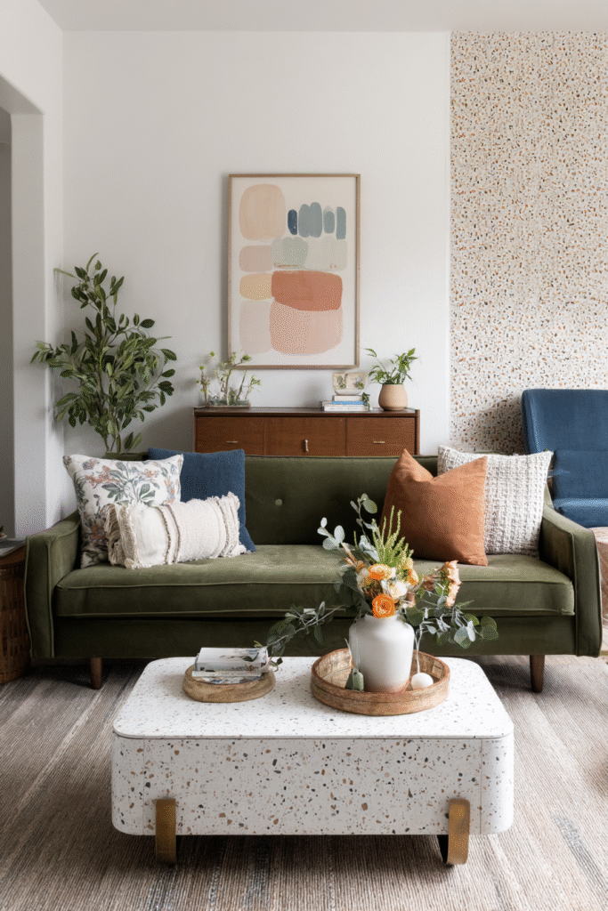 This delightful living area features an olive-green sofa paired with a colorful, abstract art piece that introduces unexpected shades of soft peach, terracotta, and pale blue. The large, modern rectangular coffee table boasts a white terrazzo finish flecked with similar colors, tying the art and the sofa together with a playful, contemporary pattern. The warm tones in the throw pillows and the mid-century console provide depth against the crisp white walls. This space feels incredibly youthful, optimistic, and skillfully blended, proving that green is the ultimate grounding neutral for brighter colors.