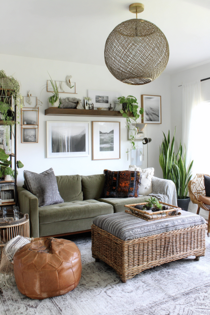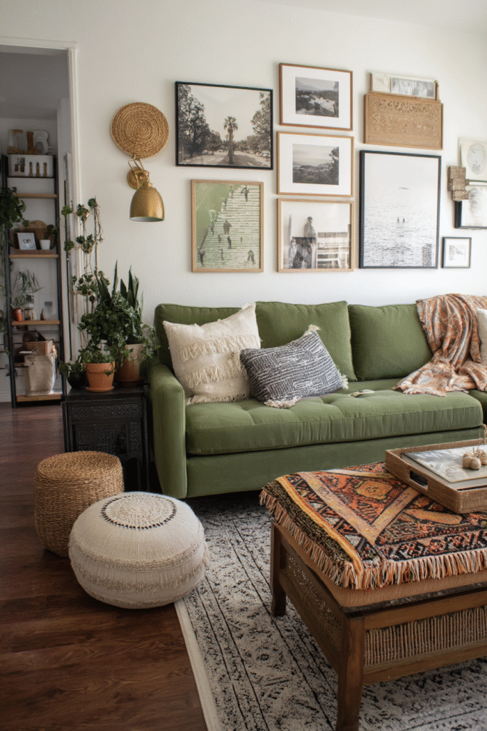 A deep, moss-green sofa grounds this richly textured, bohemian living room, which features a gallery wall of framed photos and natural fiber decor pieces. The couch is adorned with cream fringe pillows and a patterned throw, complementing the layered area rugs and the mix of woven poufs and ottomans. The design’s success lies in its abundant use of organic textures—think rattan, jute, wool, and natural wood—which gives the space a well-traveled, collected feeling. This room feels incredibly warm, lived-in, and artfully eclectic, inviting you to kick off your shoes and relax for hours. You can easily achieve this cozy, global look by layering rugs and incorporating different natural materials for coffee tables and storage.