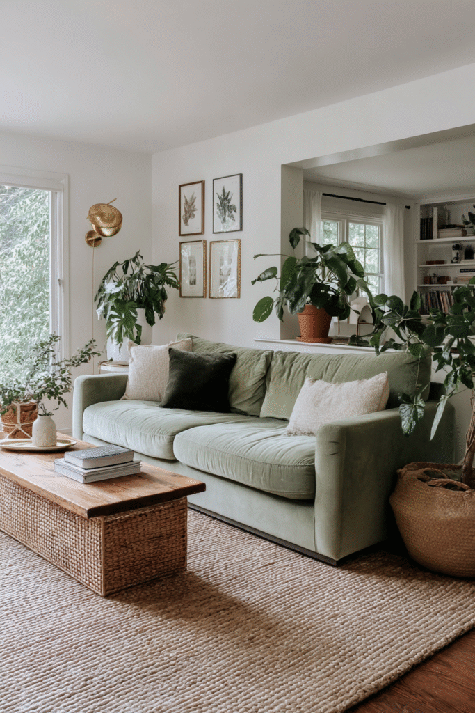 A deep, moss-green sofa with a soft, lived-in texture anchors this bright room, which is overflowing with lush, large-leafed house plants that frame the seating area. The natural jute rug and the woven coffee table introduce organic textures that echo the greenery. This design highlights the sofa’s ability to act as a natural extension of the plant life, creating a deeply connected, organic environment. The energy is one of natural abundance and tranquility, making the room feel like a truly refreshing sanctuary.