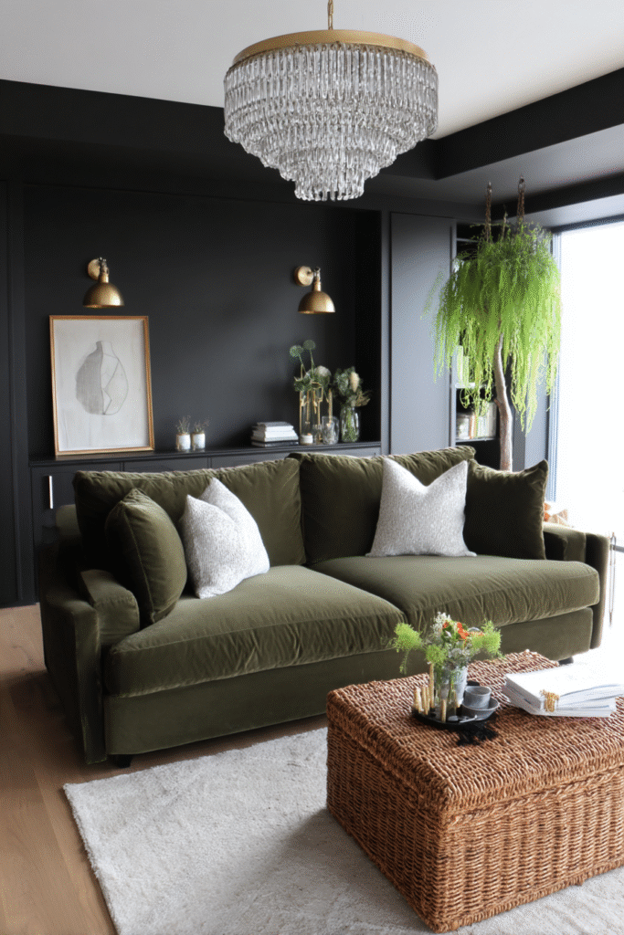 This design showcases a plush, olive-green velvet couch set dramatically against a matte black shiplap wall, creating an incredibly striking and luxurious mood. Brass accents are strategically placed in the form of elegant wall sconces and a stunning crystal chandelier, which adds a layer of unexpected glamour. The richness of the dark walls highlights the depth and texture of the velvet sofa, making the green feel even more saturated and inviting. The mood here is pure opulence and sophisticated drama, perfect for a cozy but glamorous evening retreat. To get this look, focus on mixing dark, moody paint with reflective metallic lighting and natural textures like the woven coffee table.