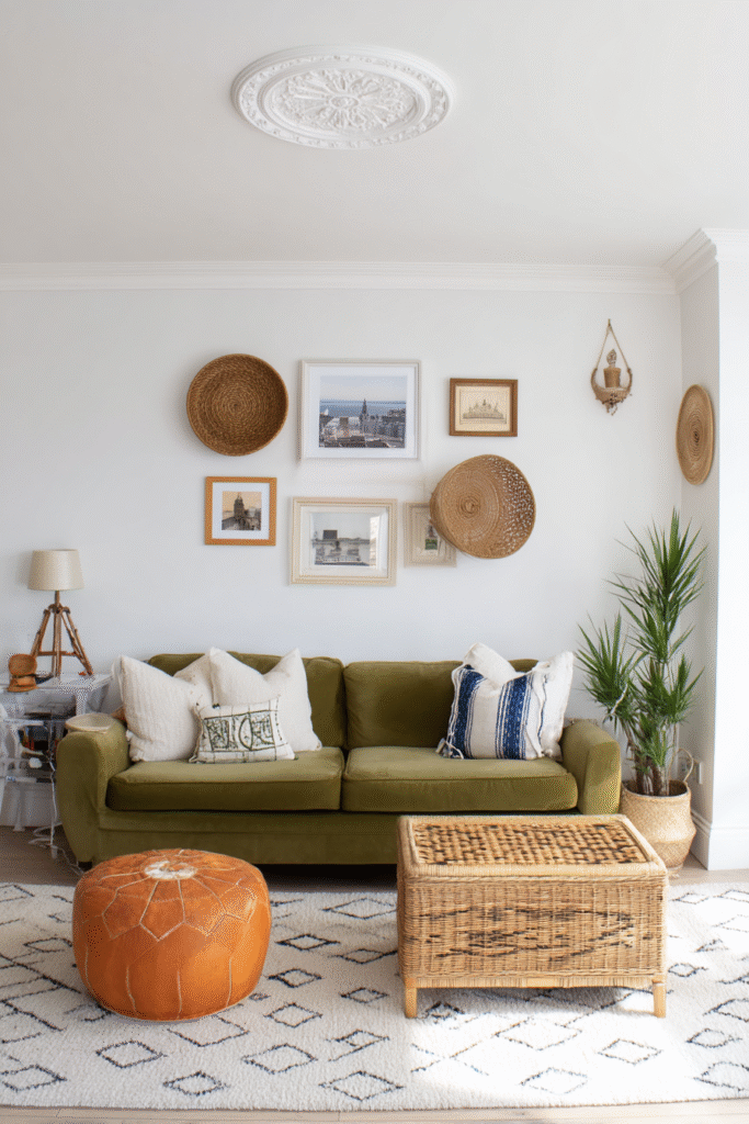 This space features a mid-tone olive velvet sofa paired with a mix of creamy, textured pillows and a striking indigo-and-white patterned cushion, set beneath an asymmetrical gallery wall of woven baskets and framed art. The combination of the warm green with the leather pouf and rattan chest coffee table creates a balanced, organic look that feels wonderfully grounded. This design expertly uses woven materials in varying sizes and colors to add visual depth to the white walls, giving the room a relaxed, bohemian, and slightly Moroccan-inspired feel. The light wood floor and natural fiber rug enhance the feeling of warmth and global charm.