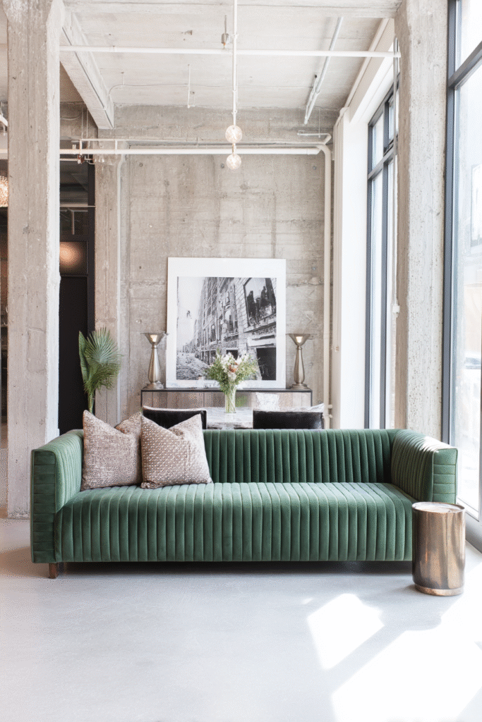 Standing out against a raw concrete loft backdrop, this stunning, channel-tufted emerald-green velvet sofa immediately commands attention with its luxurious texture and vibrant color. The sleek, streamlined shape and vertical ribbing give the piece a strong, vintage Art Deco sensibility, which is juxtaposed by the raw, industrial aesthetic of the concrete walls and exposed ceiling beams. This visual combination creates an exciting tension between modern softness and urban grit, resulting in a look that is bold, dramatic, and effortlessly chic. The room’s energy is sophisticated and fashion-forward, with the vibrant green serving as a powerful jewel-toned focal point.