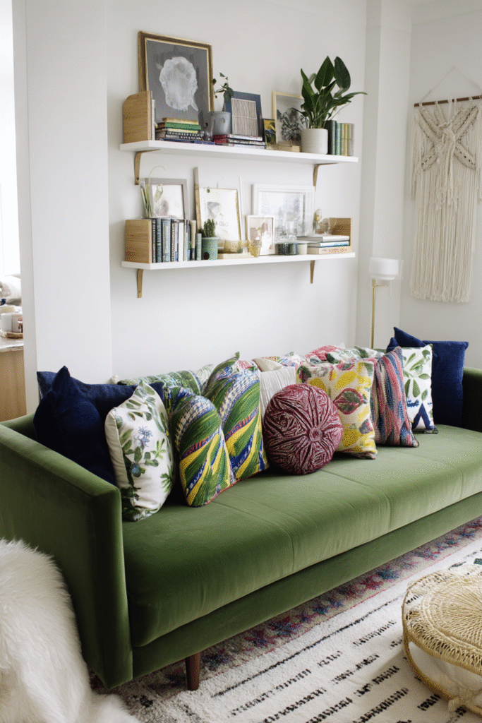 This vibrant, deep-green velvet sofa is transformed into a maximalist statement piece thanks to a riot of colorful, globally-inspired throw pillows featuring bold patterns and textures. Above the sofa, two floating wooden shelves display an array of books, framed art, and small decorative plants, creating a personalized and layered backdrop. The design beautifully balances the rich, solid base of the sofa with the joyful explosion of color and pattern, proving that green can play well with every hue. The mood is energetic, creative, and invitingly eccentric—a true reflection of a personality unafraid of color.