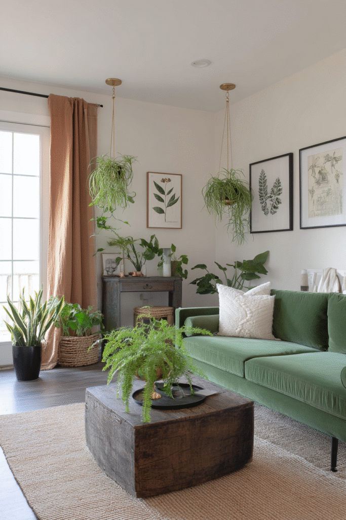 A rich, emerald-green velvet sofa takes center stage in this bright, plant-filled living room, creating a lush, greenhouse-like feeling that’s bursting with life. The space is filled with a variety of house plants, including hanging ferns and floor-standing snake plants, all complementing the couch’s deep green tone. The juxtaposition of the plush velvet with the rustic, raw wood crate coffee table and natural jute rug creates a beautiful balance between comfort and rugged nature. The whole room exudes a happy, vibrant, and incredibly earthy energy, inviting you to relax in a jungle-inspired haven.