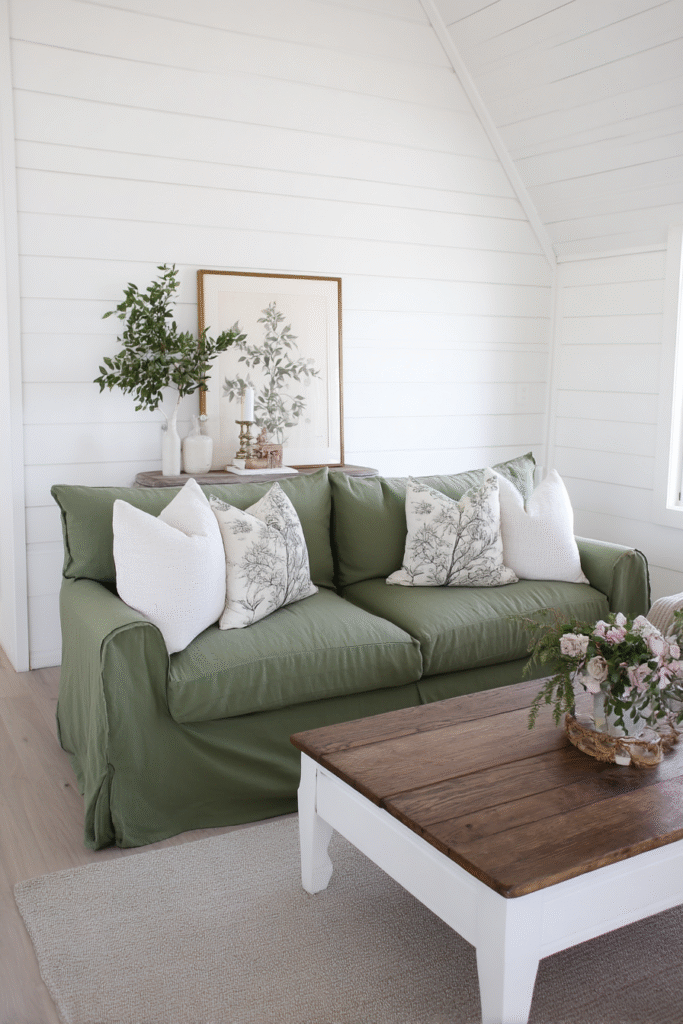 This bright living space features a casual, slipcovered sage-green sofa contrasted with white shiplap walls and light wood flooring, embodying a relaxed modern farmhouse aesthetic. The simple, linen-like fabric of the couch keeps the atmosphere unfussy, while white throw pillows and a natural wood coffee table maintain the light and airy feeling. The overall energy is very calm, peaceful, and almost coastal in its simplicity, offering a breath of fresh air. The design works because the pale green acts as a subtle color accent rather than a dominant feature, allowing the abundant natural light to truly shine. To recreate this effortless vibe, focus on light textiles, simple silhouettes, and a few botanical prints for a touch of nature.