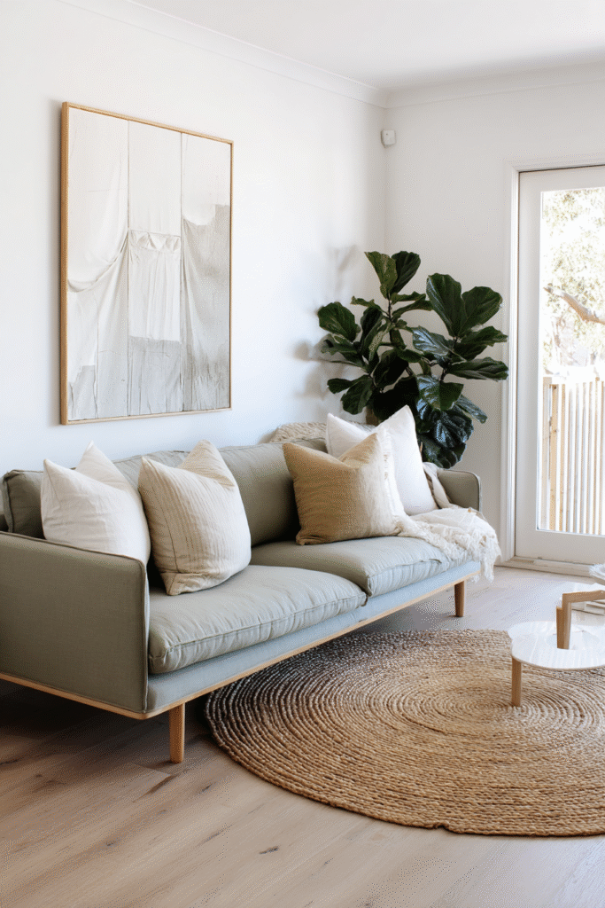 This serene space features a lighter, almost sage-green sofa with a clean, light wood frame, paired with neutral, creamy linen pillows and a large circular jute rug. The light color palette—white walls, pale wood floors, and soft neutrals—keeps the focus on the soothing textures and the gentle, restful hue of the couch. The large, contemporary abstract artwork above the sofa adds a subtle, pale pattern, reinforcing the feeling of calm and spaciousness. This room feels effortlessly organic, peaceful, and elevated, like a serene Scandinavian retreat. You can easily get this look by prioritizing natural light and sticking to a clean, simple color scheme.
