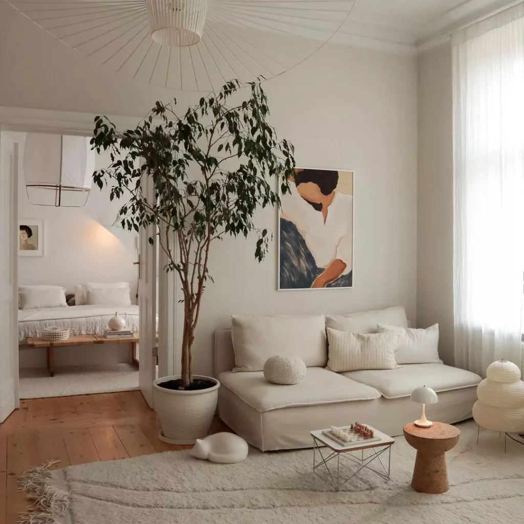 This space is incredibly bright and airy, utilizing off-white tones for the walls, sofa, and chunky rug, allowing the natural light to truly flood the room. A large, beautiful indoor tree becomes the main artistic focal point.