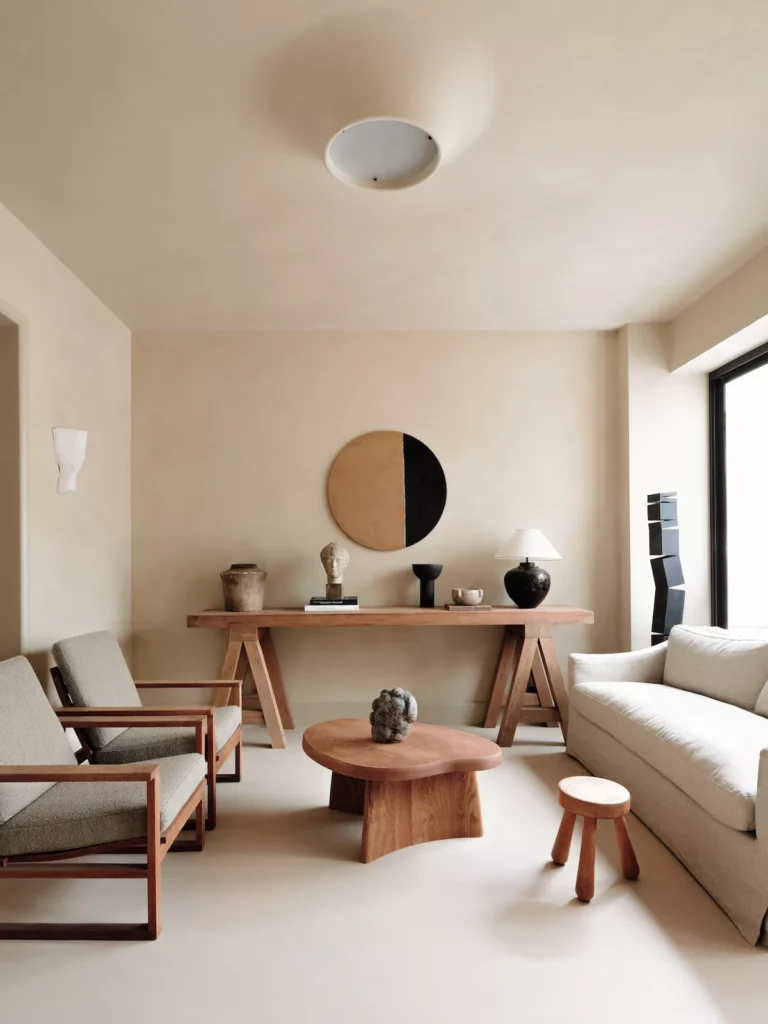 Moving away from stark white, this room uses a cohesive monochromatic palette of warm beige and pale tan, creating an embracing, earthy envelope. The two low, minimalist wooden chairs introduce strong, simple lines.
