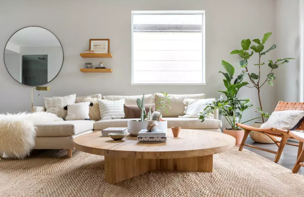 When choosing a coffee table, a large, thick-cut wood circle provides a natural, grounding, and communal feel.