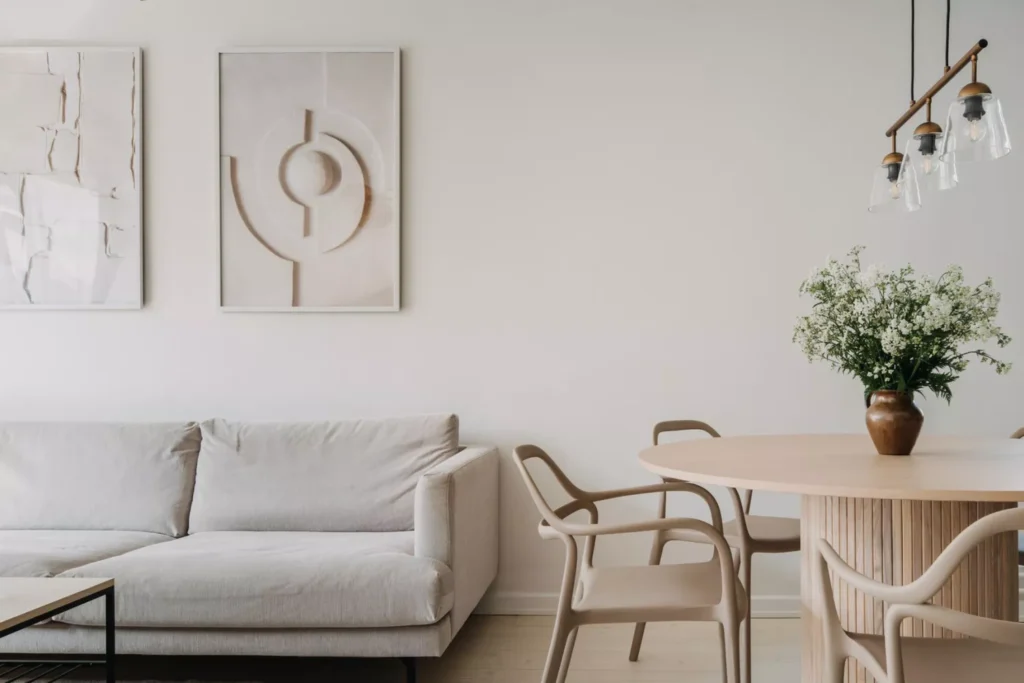 The minimalist wall art features soft lines and tonal colors that complement the beige and gray furniture palette. A vase of white baby’s breath adds a delicate, natural centerpiece to the table.