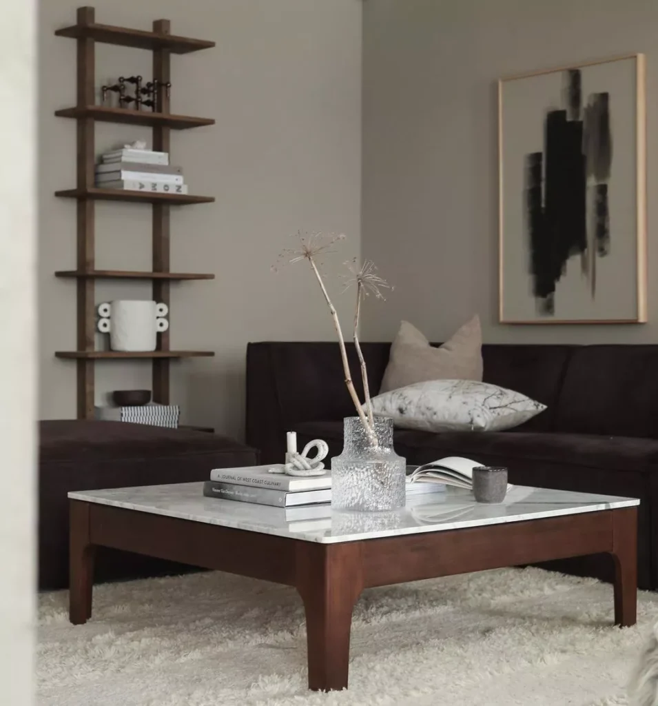 This look demonstrates how Japandi can work with a richer, darker color scheme, featuring a deep espresso-colored sofa contrasted by bright white accents. The coffee table has a heavy marble top, introducing a sleek, refined material.