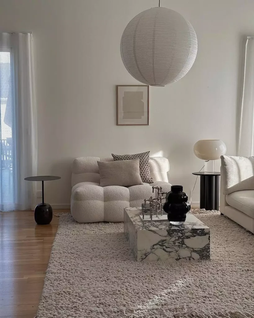 This space balances soft, fluffy texture with the coolness of stone. A cloud-like, bouclé armchair and a shaggy area rug provide extreme comfort, which is sharply contrasted by the large, rectilinear marble coffee table.