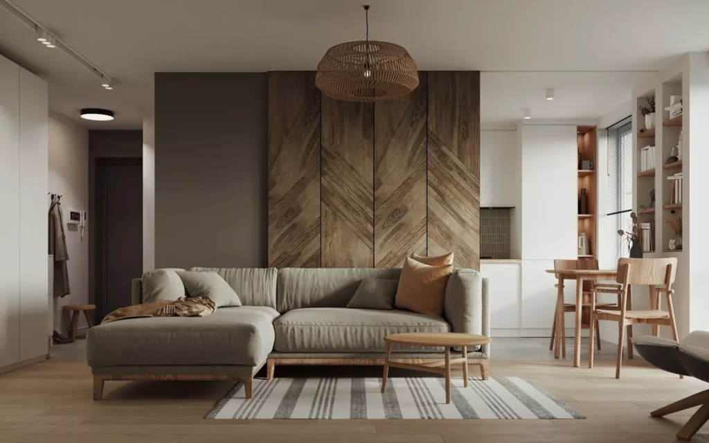 A stunning focal point is created here by an accent wall covered in a rich, geometric wood paneling pattern that draws the eye and anchors the space. A modern, low-slung sofa in a neutral taupe sits comfortably in the foreground.