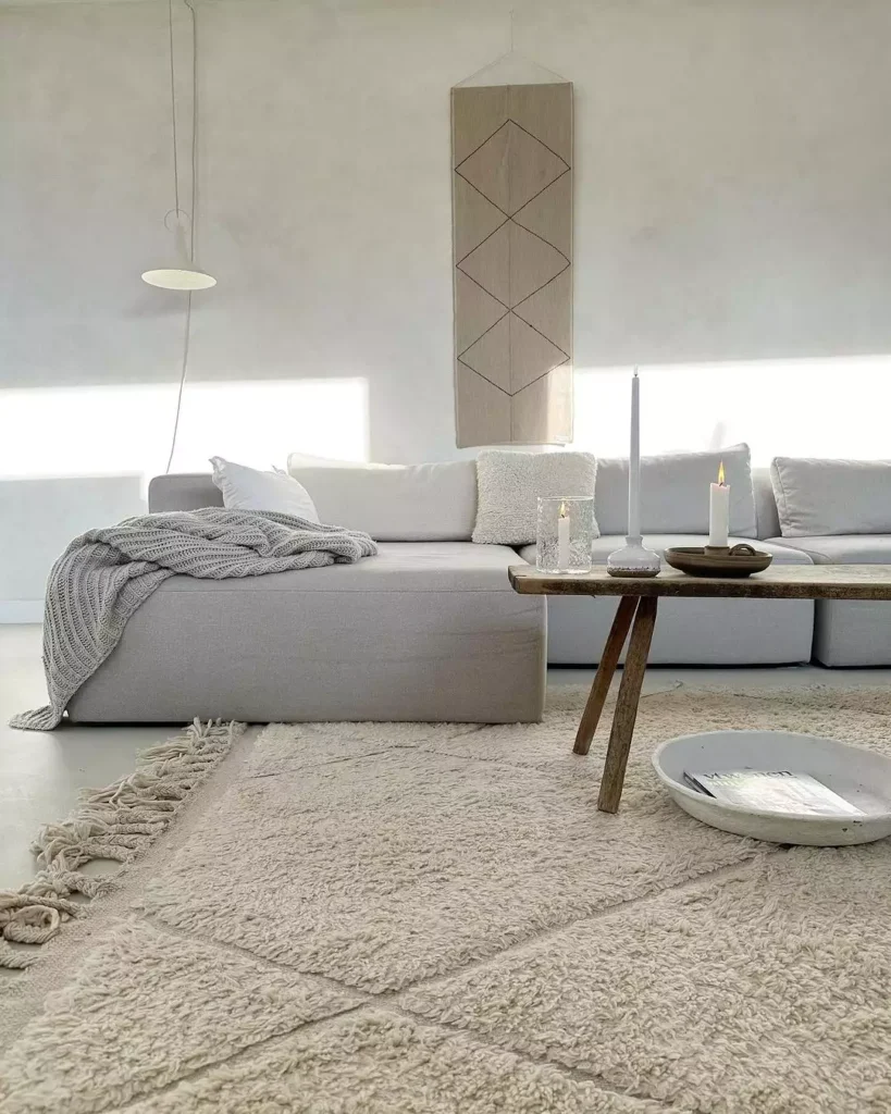 Would you like me to find some shopping links for low-profile wooden coffee tables or soft, chunky Japandi-style throw blankets?