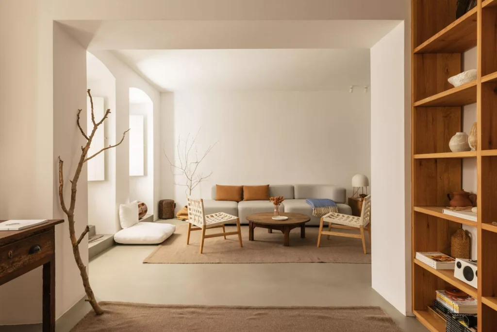 The mood is one of quiet contemplation and organic simplicity, making the space feel clean yet approachable.