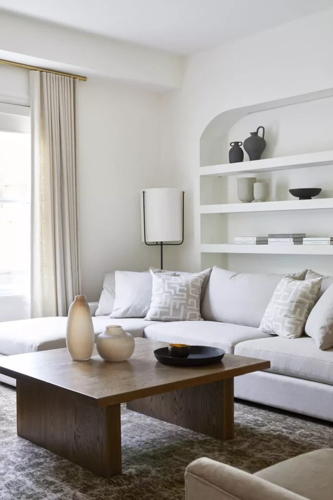 This classic living room showcases neat, built-in shelving in an arched nook, perfect for a curated display of minimalist pottery and monochromatic books. The large sectional sofa provides ample, comfortable seating.