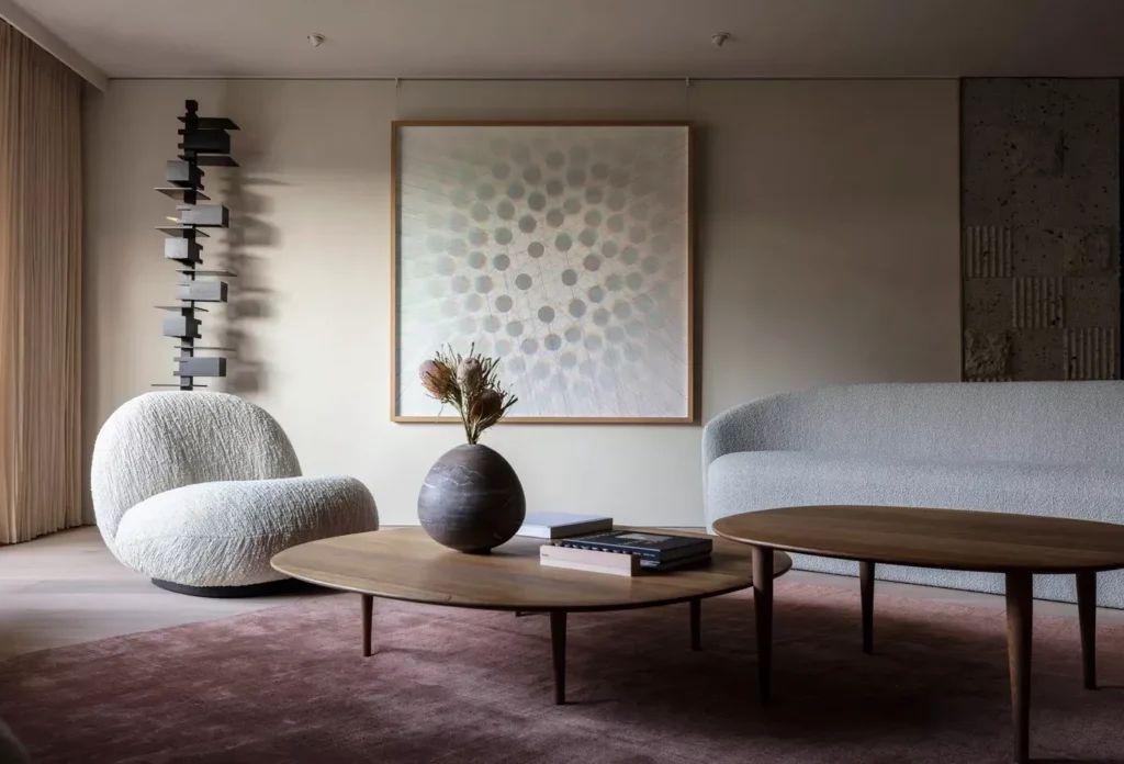 The overall feeling is artful and enveloping, a calm space where every piece feels like a carefully chosen sculpture.