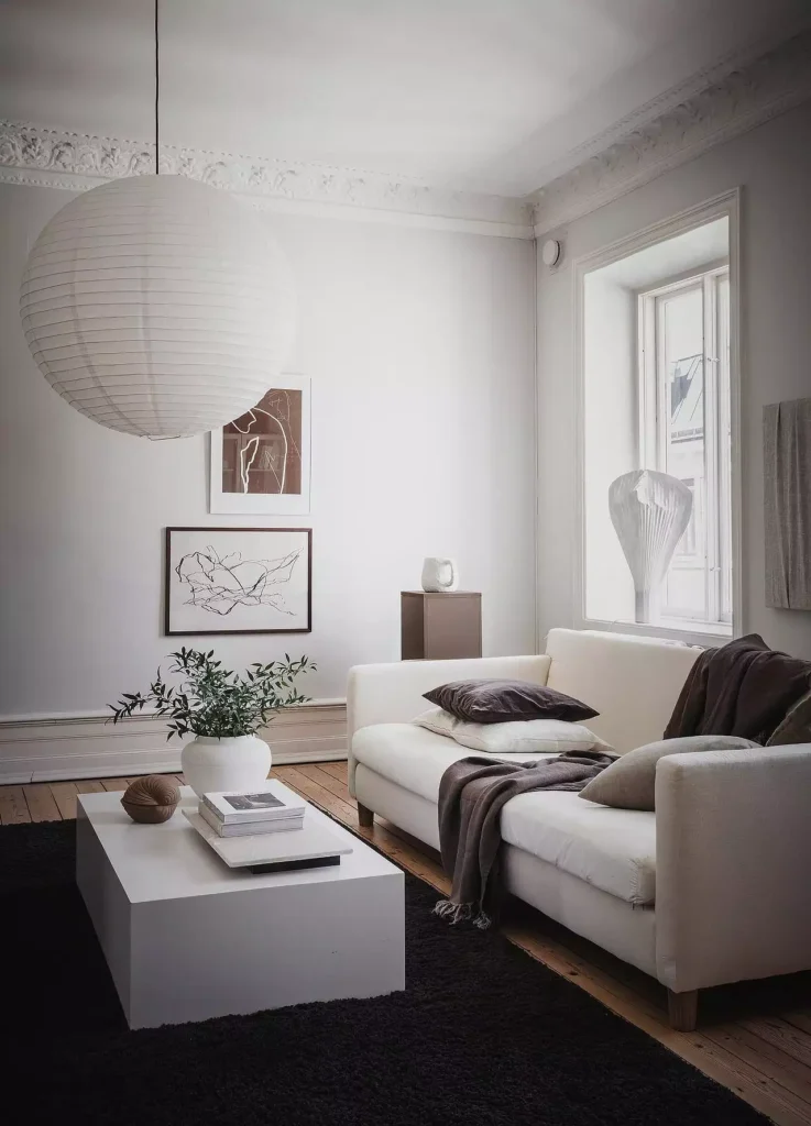 Here we see a beautiful application of dark grounding elements against a bright, clean backdrop. The classic white, simple sofa is contrasted by a shaggy, deep charcoal rug and a matching throw, adding immediate depth and coziness.