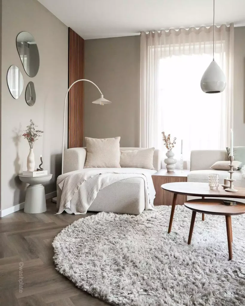 This living area uses soft, natural colors—a mushroom-taupe wall, warm wood accents—to create an enveloping and cozy atmosphere. The rounded shag rug and the curved back of the lounge chair introduce gentle, organic shapes.