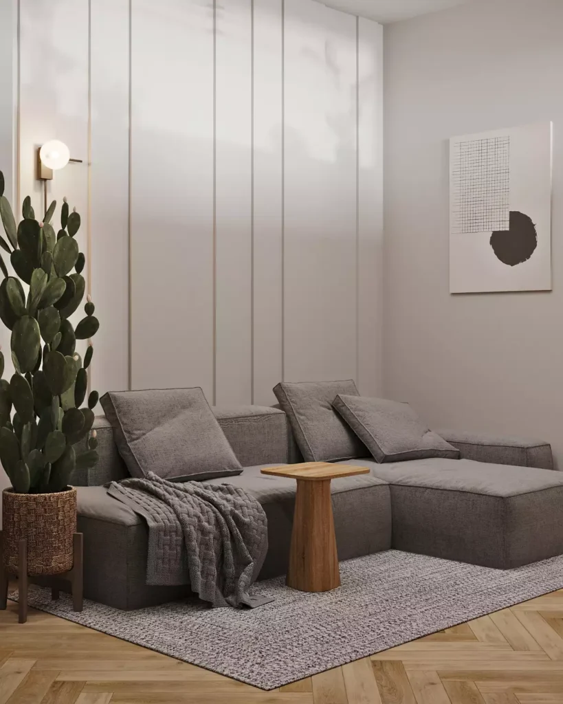 This image showcases the comfort-first approach of Japandi with a deep, gray modular sofa that looks incredibly inviting. The simple wooden side table has a sculptural, organic shape that prevents the room from feeling too blocky or modern.