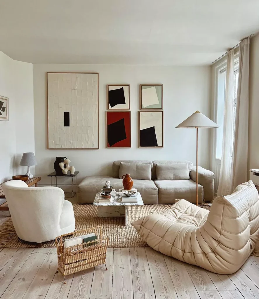 This space feels sophisticated and elevated, merging an appreciation for modern art with a desire for soft, enveloping comfort.