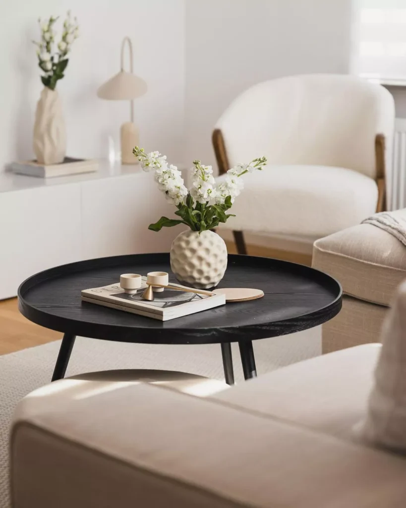 This close-up shot focuses on the simple, textural styling that makes Japandi feel so rich. A beautiful matte black round coffee table serves as a dramatic anchor for a subtly textured white vase holding delicate white flowers.