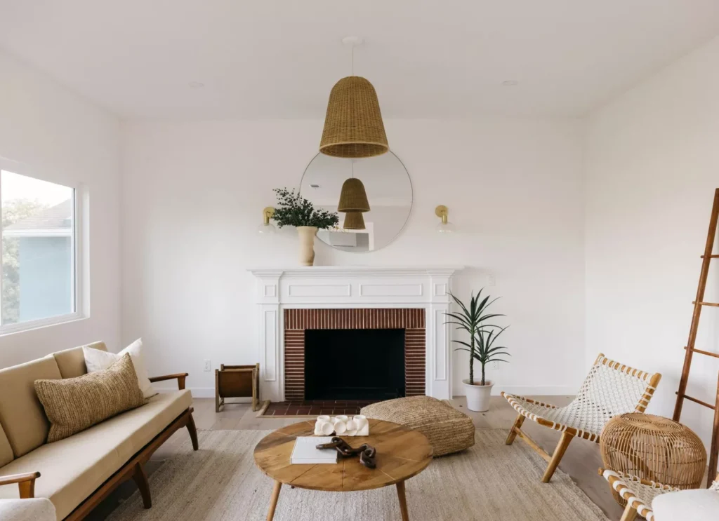 The design finds its balance in the pairing of the bright white walls and the earthy textures of the jute rug, the textured pillows, and the rattan accents. The red-brick fireplace adds an unexpectedly charming, grounding focal point.