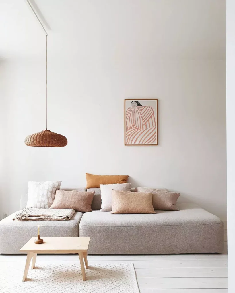 This beautifully sparse room features a low, ultra-simple modular sofa in a pale gray-beige, adorned with multiple pillows in soft blush, dusty rose, and muted terracotta tones. This is a subtle way to introduce color while maintaining a neutral base.