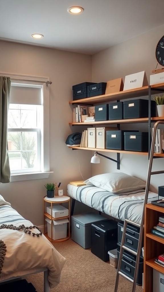 In a triple dorm room, space can feel limited. The image shows a smart use of vertical storage that maximizes the area available. Shelves above the beds hold boxes and books, keeping the floor clear and organized.