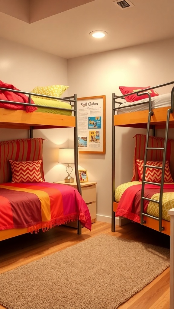 Bunk beds are a fantastic way to make the most of a small dorm room. In the image, you can see a cozy setup with two sets of bunk beds, each adorned with colorful bedding. This design not only saves space but also adds a fun vibe to the room.