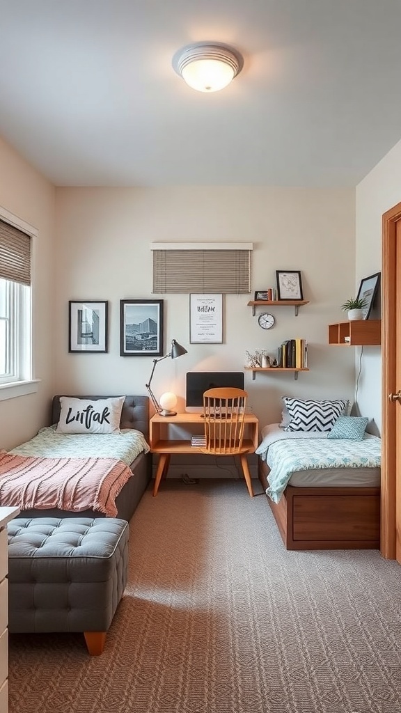 When designing a triple dorm room, multi-functional furniture is a lifesaver. The image shows a cozy space with two beds and a shared study area. Each bed has its own unique bedding, adding a personal touch while keeping the room stylish.