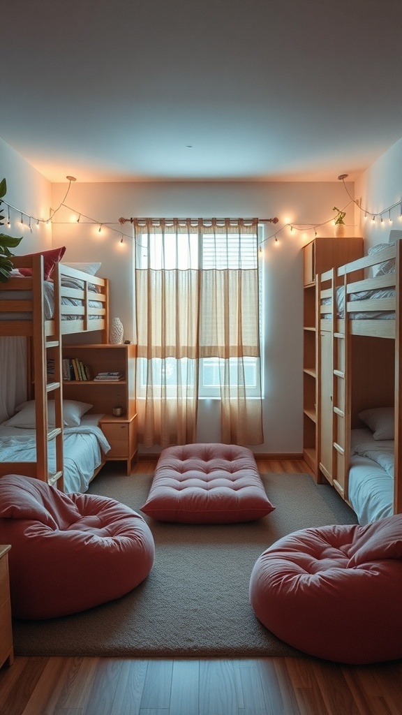 The layout features two sets of bunk beds, maximizing sleeping space while leaving room for a lounge area. The soft lighting from the string lights adds warmth, making it a perfect spot for friends to hang out after a long day of classes.