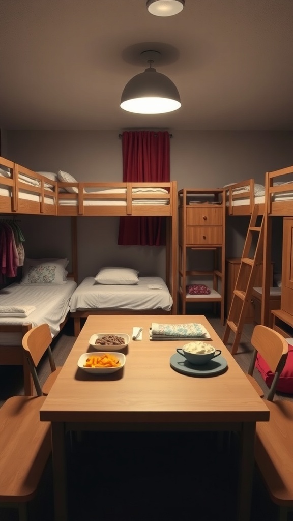 Creating a communal dining area in a triple dorm room can really bring everyone together. The image shows a cozy setup with a simple wooden table and chairs, perfect for sharing meals and stories. The table is adorned with some snacks, making it inviting for casual gatherings.