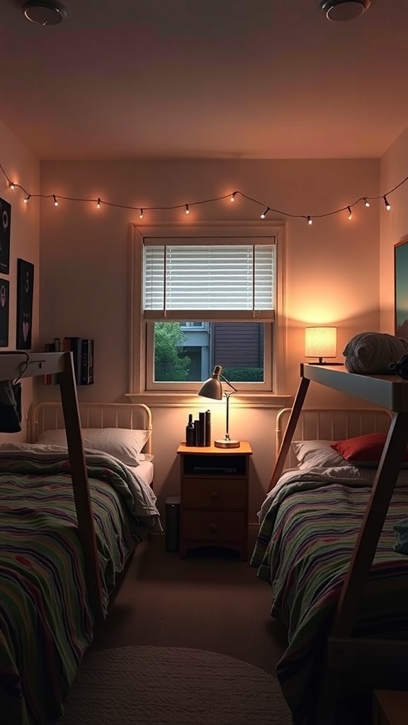 Creating a cozy atmosphere in a triple dorm room can be easily achieved with the right lighting. The image shows a warm and inviting space, perfect for relaxation and study. String lights add a playful touch, draping across the walls and providing soft illumination.