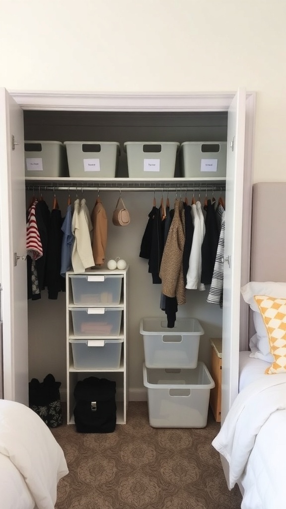 Using clear bins allows you to see what’s inside without opening each one. This can save time when you’re in a rush. The overall design is simple yet effective, making it a great example for anyone looking to design a shared closet space in a dorm.
