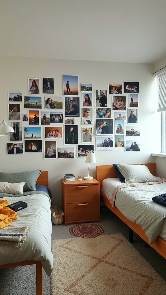 A gallery wall can truly transform a triple dorm room into a cozy and inviting space. The image shows a wall filled with a collection of photos that capture special moments. Each picture tells a story, making the room feel personal and lived-in.