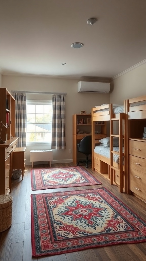 These rugs not only add color but also serve a practical purpose. They can help define sleeping areas from study spaces. This is especially useful in a shared room where boundaries are important. The patterns and colors of the rugs can reflect the personalities of the roommates, making the space feel more like home.